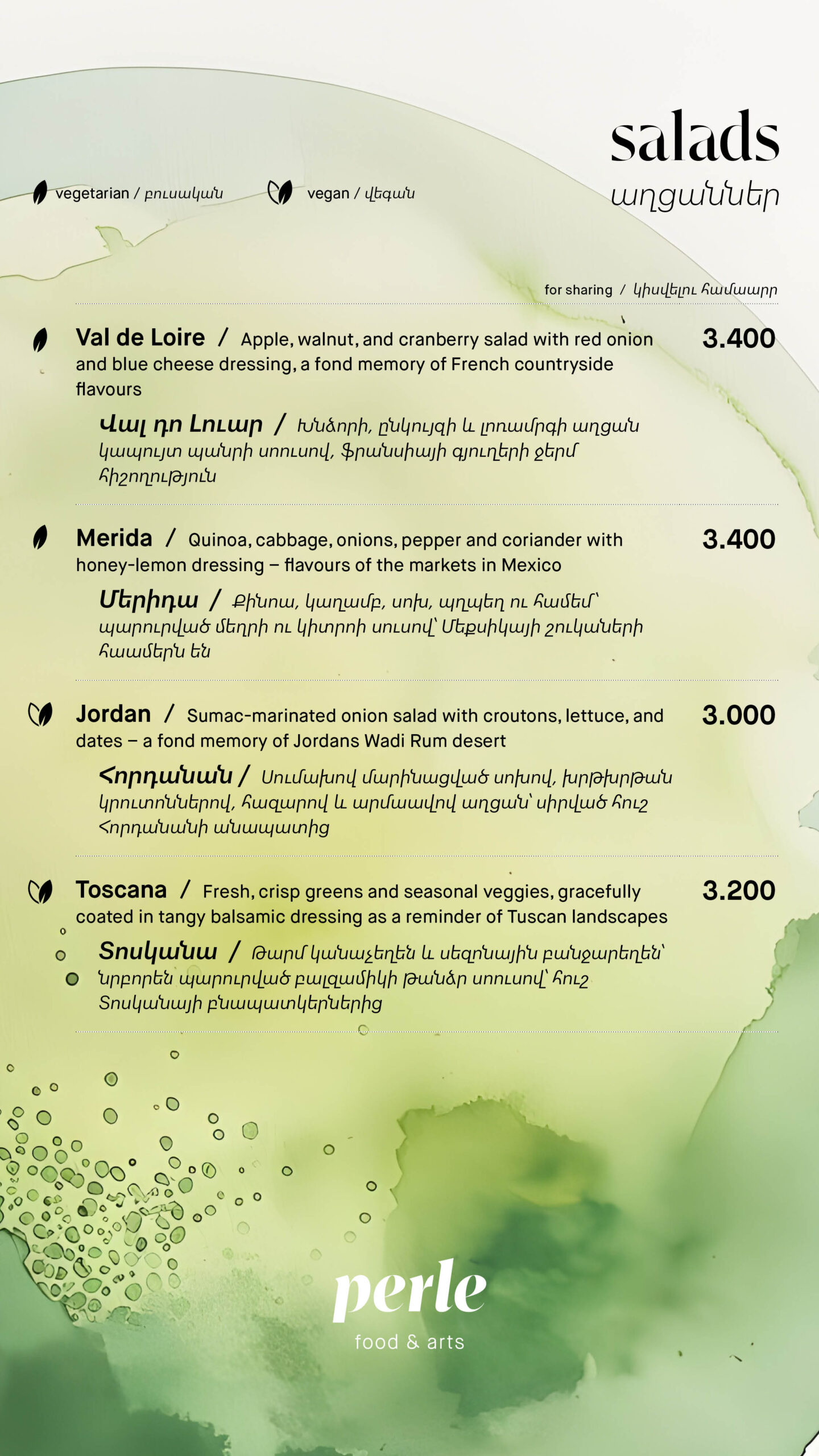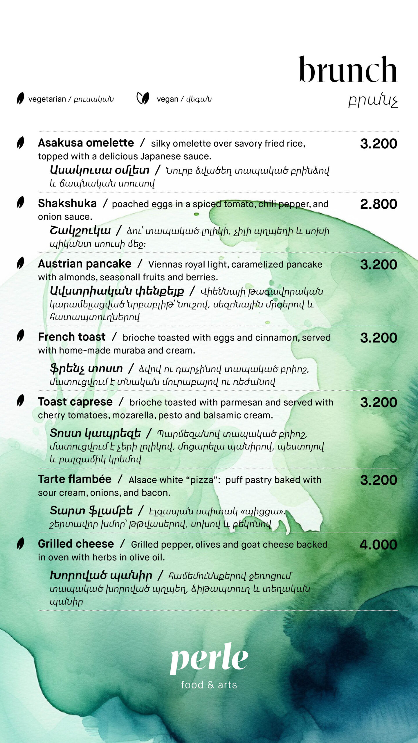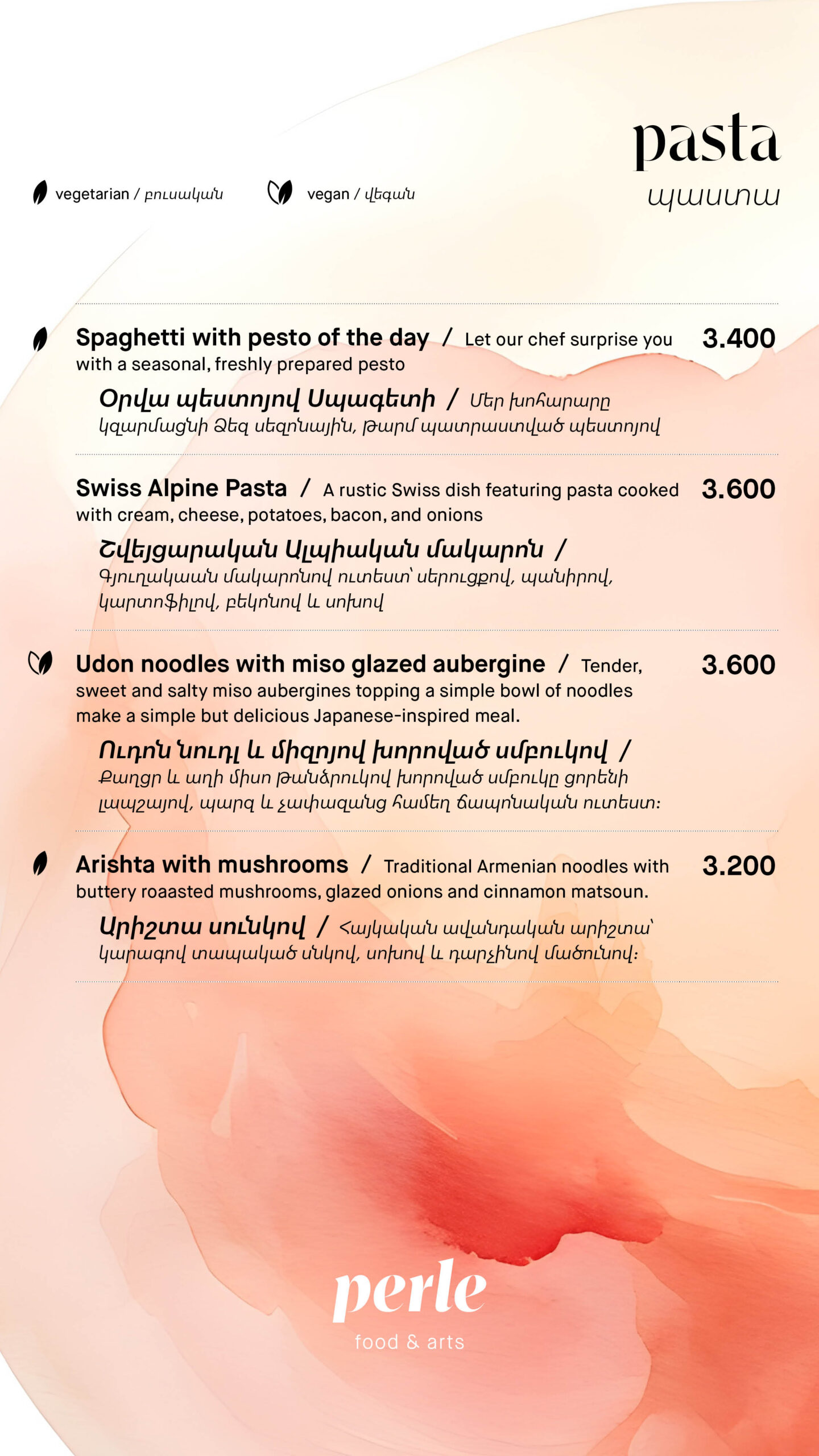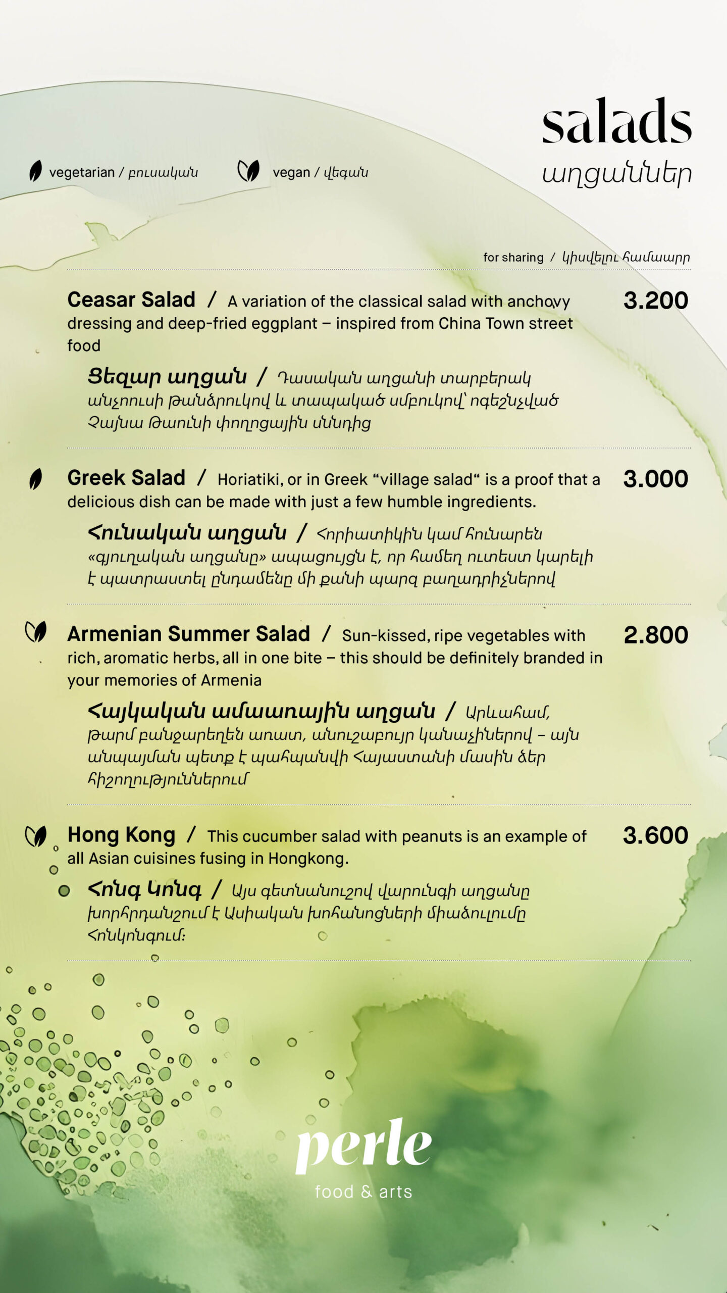 Perle’s culinary concept is a travel story narrated by its creator, Tatevik, who brings her world journeys to life through the menu.